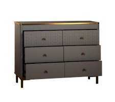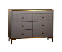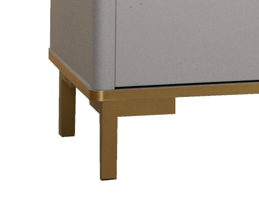 Корпус и фасады комода изготавливается в ЛДСП цвета Серый. Кромка, ручки и опоры золотого цвета. В сочетании с золотом серые тона выглядят не скучно, а золото приобретает благородный оттенок, что в итоге дает изысканное и утонченное сочетание.