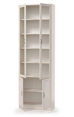 Шкаф В-19- двухстворчатый шкаф с распашными фасадами. Шкаф имеет наибольшую ширину из всех библиотечных модулей, он вместительный и функциональный. Нижние фасады глухие, они позволяют хранить те вещи, которые нужно спрятать от посторонних глаз. Верхние фасады со стеклянными вставками, они позволят сделать просматриваемыми предметы, которые радуют глаз, будь то посуда или книги. Прочные полки из ЛДСП выдерживают вес до 5 кг. Полки выполнены в цвет корпуса шкафа. Фасады крепятся на металлические петли без доводчиков.