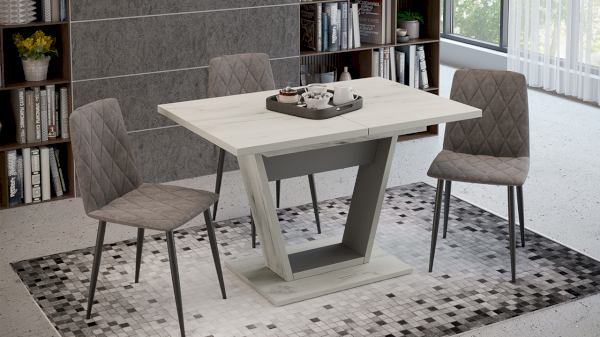 В оформлении новинки применяются актуальные варианты декора, что подчёркивает универсальность стола. Модные текстуры «Дуб крафт золотой», «Дуб крафт белый» в сочетании с цветами чёрный и серый графит, придадут ощущение тепла и уюта в кухонном интерьере.