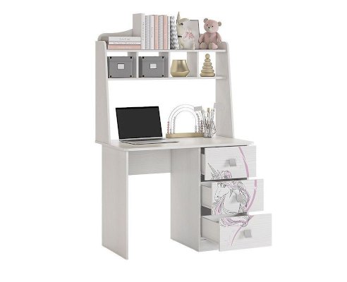 Стильный и модный стол детской «Фэнтези» - обрадует каждого ребенка. Компактный стол прекрасно впишется даже в маленькое пространство детской комнаты. Удобная столешница подойдет как для письма, так и для занятий на компьютере или ноутбуке. Открытые полки надстройки стола хорошо подходят для хранения учебников и школьных принадлежностей. В 3-х выдвижных ящиков поместится все, что необходимо для учебы и творчества. Необычный принтерный рисунок на фасадах выдержан в общем стилистическом решении. Рисунок устойчив к истиранию и ультрафиолету.