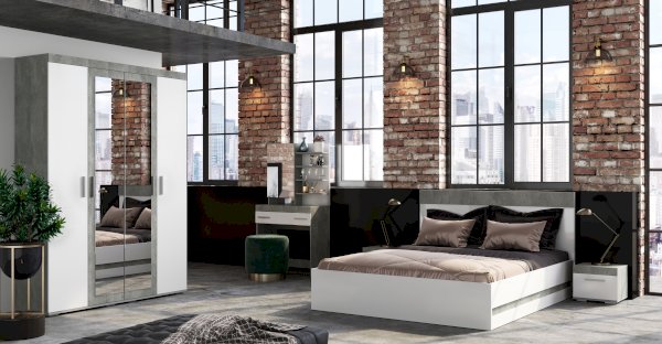 Современный четырёхстворчатый шкаф Инстайл выполнен в стиле одноименной модульной коллекции мебели. Модель состоит из четырех дверок, две из которых – зеркальные. Изделие выполнено в комбинации белого и цвета бетон. Внутреннее наполнение состоит из двух отделений со штангами, а также верхних и нижних полок для вещей. Стильный геометрические ручки украшают шкаф Инстайл.