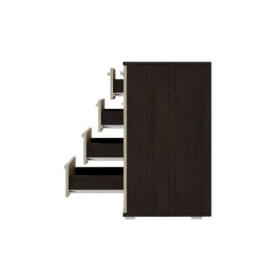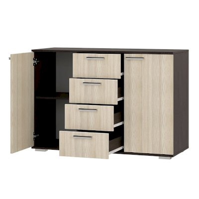 Комод Стандарт №2 – прекрасный выбор для спальни или гостиной! Данная модель состоит из четырех центральных выдвижных ящиков, а также двух боковых секций с распашными дверцами. Комод позволит вместить большое количество вещей, одежды и любых мелочей.