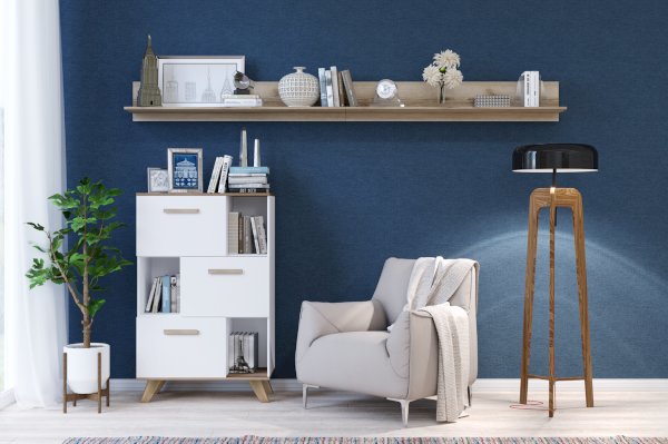 Низкий шкаф с нишами — это практичное решение для гостиной или спальни. Его конструкция — своего рода шкаф-стеллаж, который предназначен для хранения вещей, книг и посуды как в открытом, так и в закрытом виде.