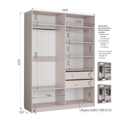 Наполнение: Петли с доводчиками, 2 ящика на шариковых направляющих, полки, штанга