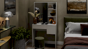 Помимо внешней привлекательности стол имеет большое зеркало, за которым размещены скрытые полки для хранения всех необходимых аксессуаров и косметики. Наличие открытых полок позволит установить предметы декора, а практичный выдвижной ящик и секция за распашной дверцей добавит места для необходимых мелочей. В этом туалетном столике нет ничего лишнего, только самое необходимое для уголка женской красоты.