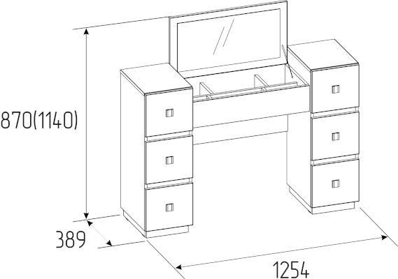 Туалетный столик просто необходим красивой женщине, которая привыкла обстоятельно ухаживать за собой. Стильный и функциональный он не займет много места в спальне. Разместите его в у окна, чтобы приводить себя в порядок при естественном освещении. Откидная крышка стола с зеркалом скрывает нишу с делителем для хранения аксессуаров, а в 6-ти выдвижных ящиках, глубиной 30 см, высотой 15 см и шириной 20 см, найдется место для множества баночек и флакончиков. Кроме того, ящики оснащены шариковыми направляющими, что обеспечивает их плавных ход и минимальный люфт.